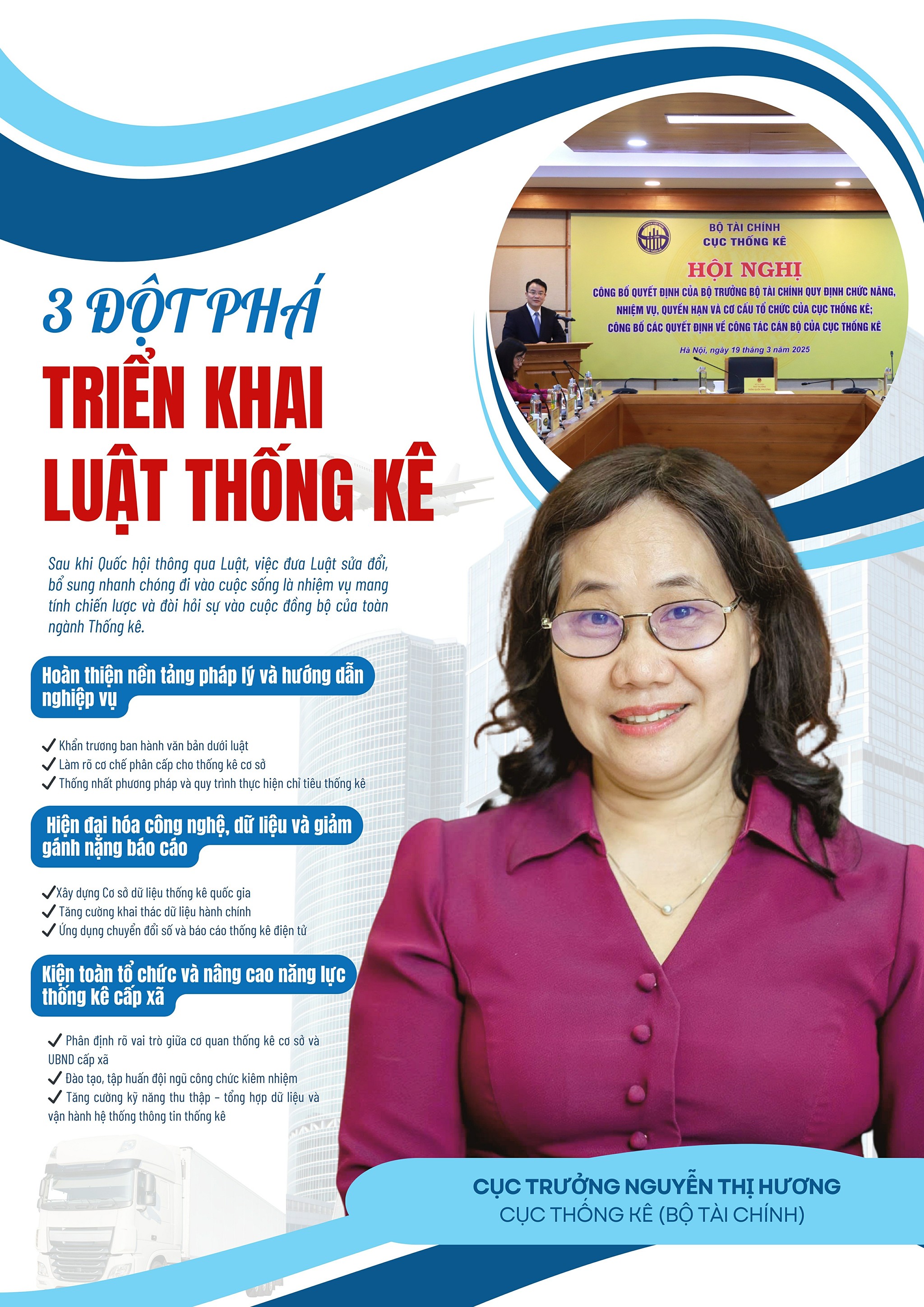 Cục trưởng Nguyễn Thị Hương: Luật Thống kê năm 2015 được Quốc hội khóa XIII thông qua tại Kỳ họp thứ 10 ngày 23/11/2015 và có hiệu lực từ ngày 1/7/2016. Việc ban hành Luật cùng các văn bản sửa đổi sau đó đã tạo chuyển biến tích cực trong toàn bộ hoạt động thống kê.