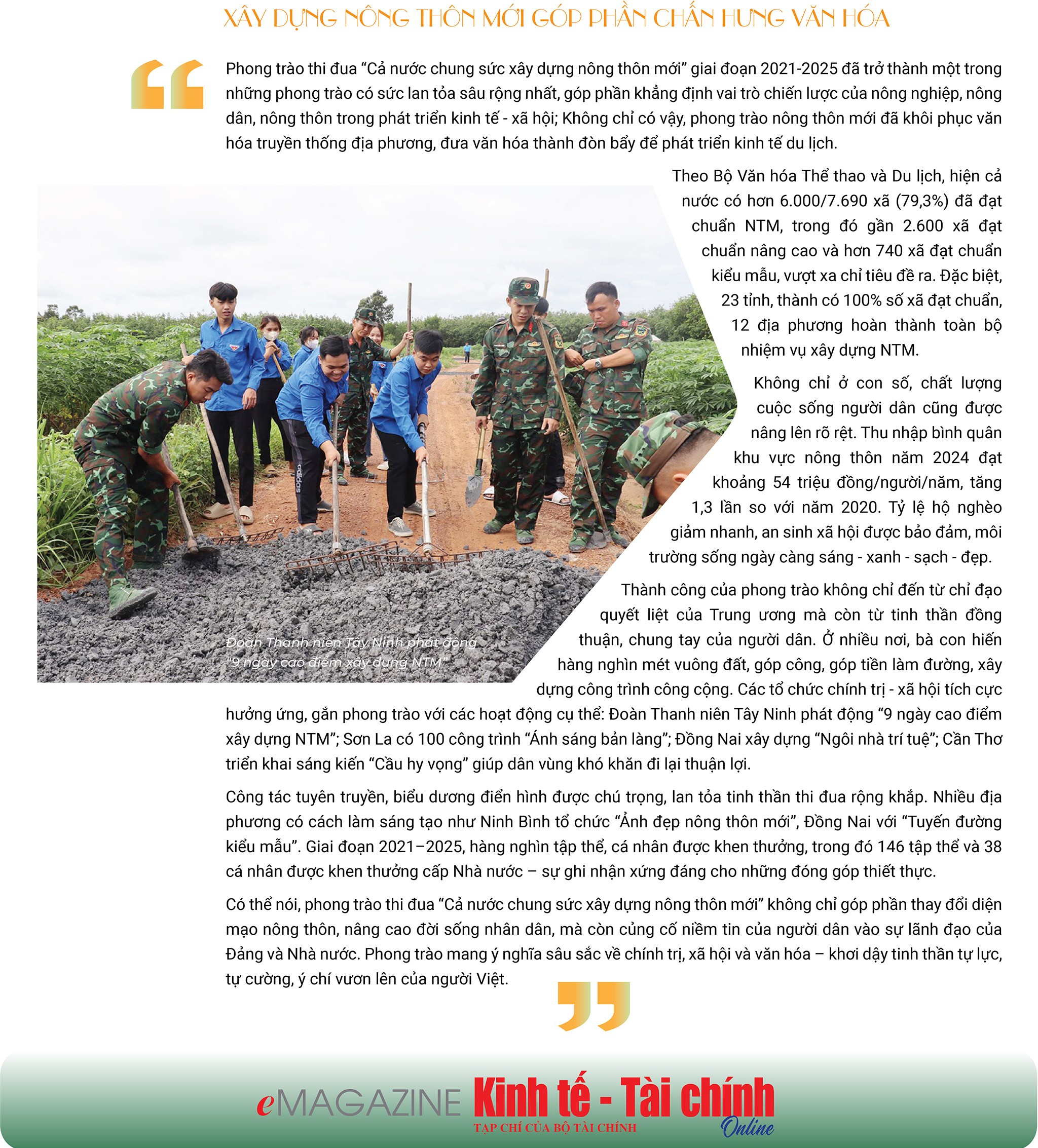 Nếu như giai đoạn đầu chương trình nông thôn mới chủ yếu tập trung vào việc xây dựng đường, trường, trạm, thì những năm gần đây, trọng tâm chuyển sang bồi đắp đời sống văn hóa, khơi dậy tinh thần đoàn kết, tự quản của người dân. Tại nhiều địa phương, kết quả xây dựng nông thôn mới đã chứng minh rằng, văn hóa chính là gốc rễ để nông thôn phát triển bền vững.