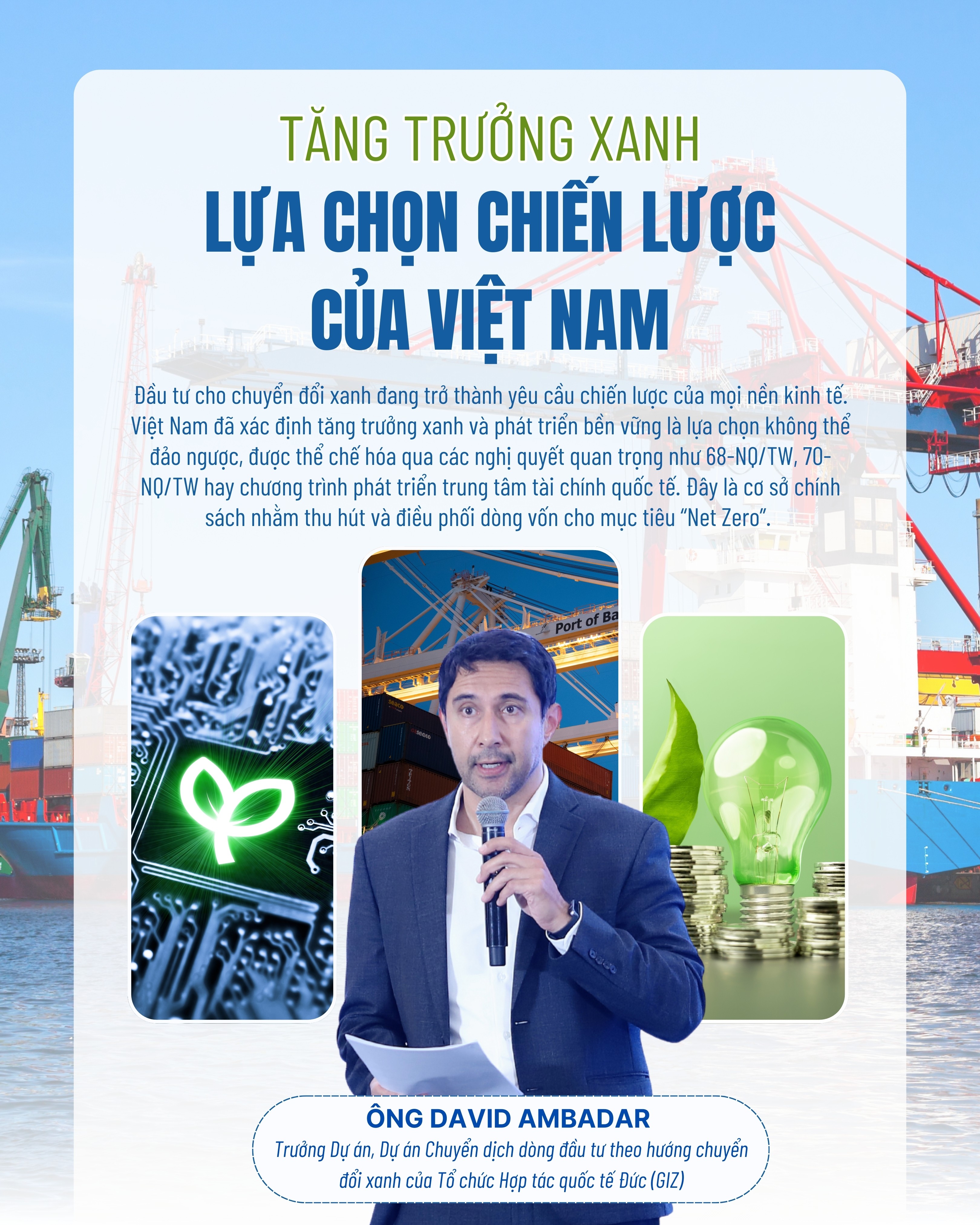 Tại Diễn đàn, ông David Ambadar - Trưởng Dự án, Dự án Chuyển dịch dòng đầu tư theo hướng chuyển đổi xanh của Tổ chức Hợp tác quốc tế Đức (GIZ) nhấn mạnh rằng, đầu tư cho chuyển đổi xanh đang trở thành yêu cầu chiến lược của mọi nền kinh tế. Việt Nam đã xác định tăng trưởng xanh và phát triển bền vững là lựa chọn không thể đảo ngược, được thể chế hóa qua các nghị quyết quan trọng như 68-NQ/TW, 70-NQ/TW hay chương trình phát triển trung tâm tài chính quốc tế. Đây là cơ sở chính sách nhằm thu hút và điều phối dòng vốn cho mục tiêu “Net Zero”.