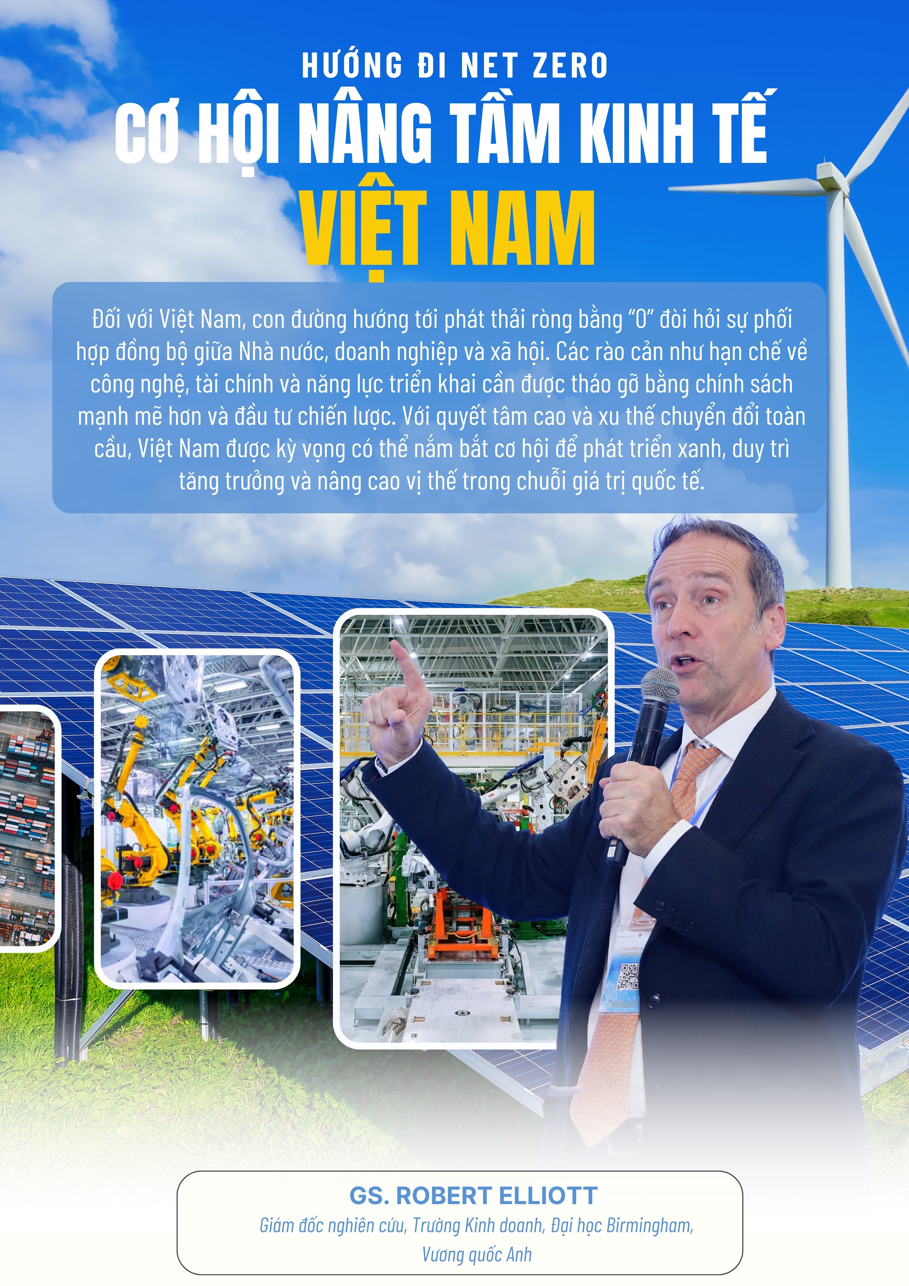 GS. Robert Elliott cũng phân tích nhiều kinh nghiệm quốc tế về chuyển đổi xanh, trong đó nhấn mạnh tầm quan trọng của khung chính sách và cơ chế vận hành hiệu quả. Những quốc gia thành công thường kết hợp thuế carbon, thị trường phát thải và hỗ trợ doanh nghiệp theo lộ trình rõ ràng. Đồng thời, yếu tố công bằng trong chuyển đổi, đảm bảo không nhóm dân cư hay ngành nghề nào bị bỏ lại phía sau – được xem là trụ cột của phát triển bền vững.