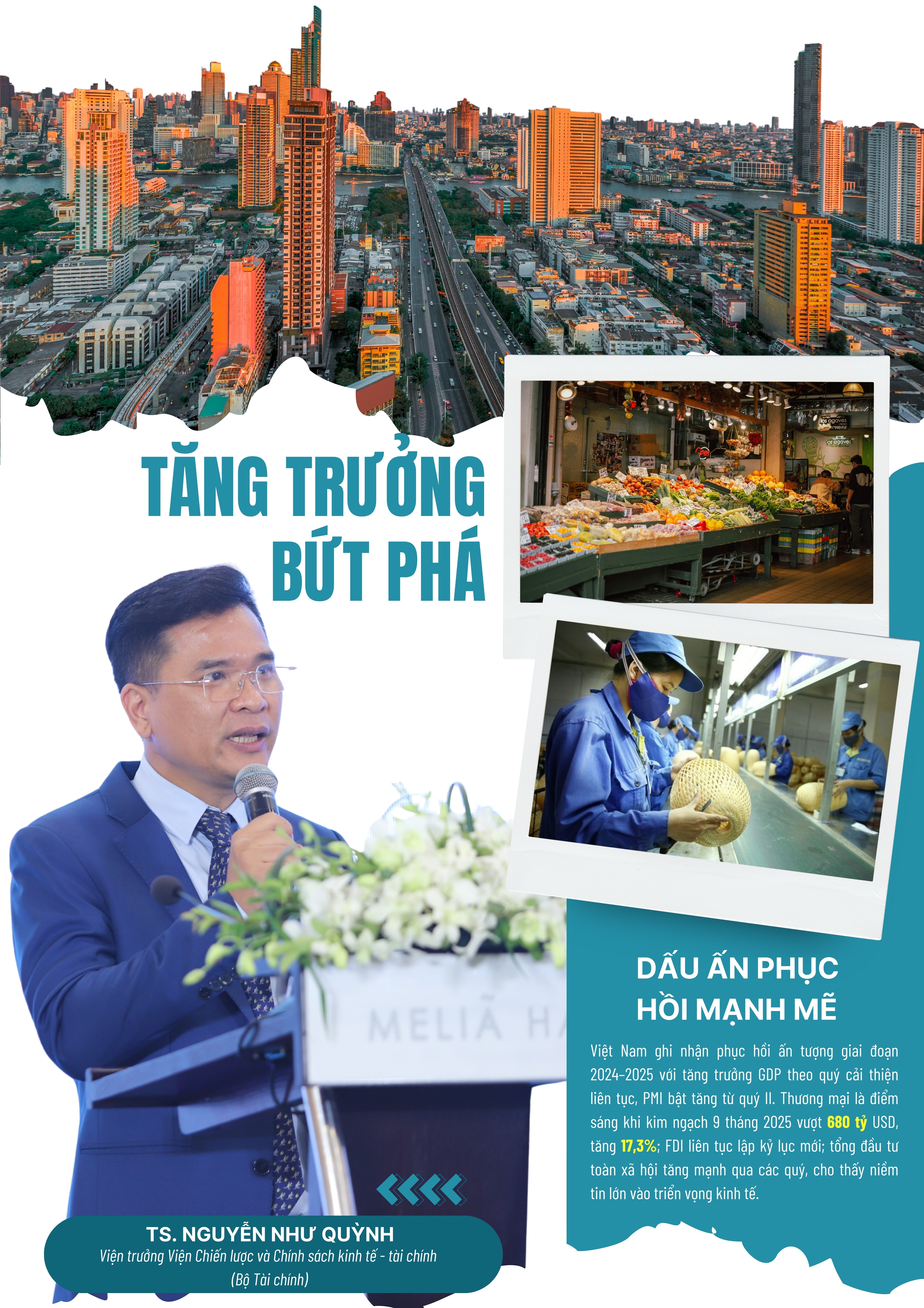 Theo TS. Nguyễn Như Quỳnh - Viện trưởng Viện Chiến lược và Chính sách kinh tế - tài chính (Bộ Tài chính), Việt Nam bước vào giai đoạn 2024-2025 với mức phục hồi kinh tế nhanh hơn nhiều quốc gia trong khu vực, thể hiện qua tăng trưởng GDP theo quý cải thiện liên tục và các chỉ số PMI bật tăng mạnh từ quý II. Sự phục hồi này được hỗ trợ bởi quyết tâm cao của toàn hệ thống chính trị, sự ổn định vĩ mô và phục hồi tiêu dùng nội địa.