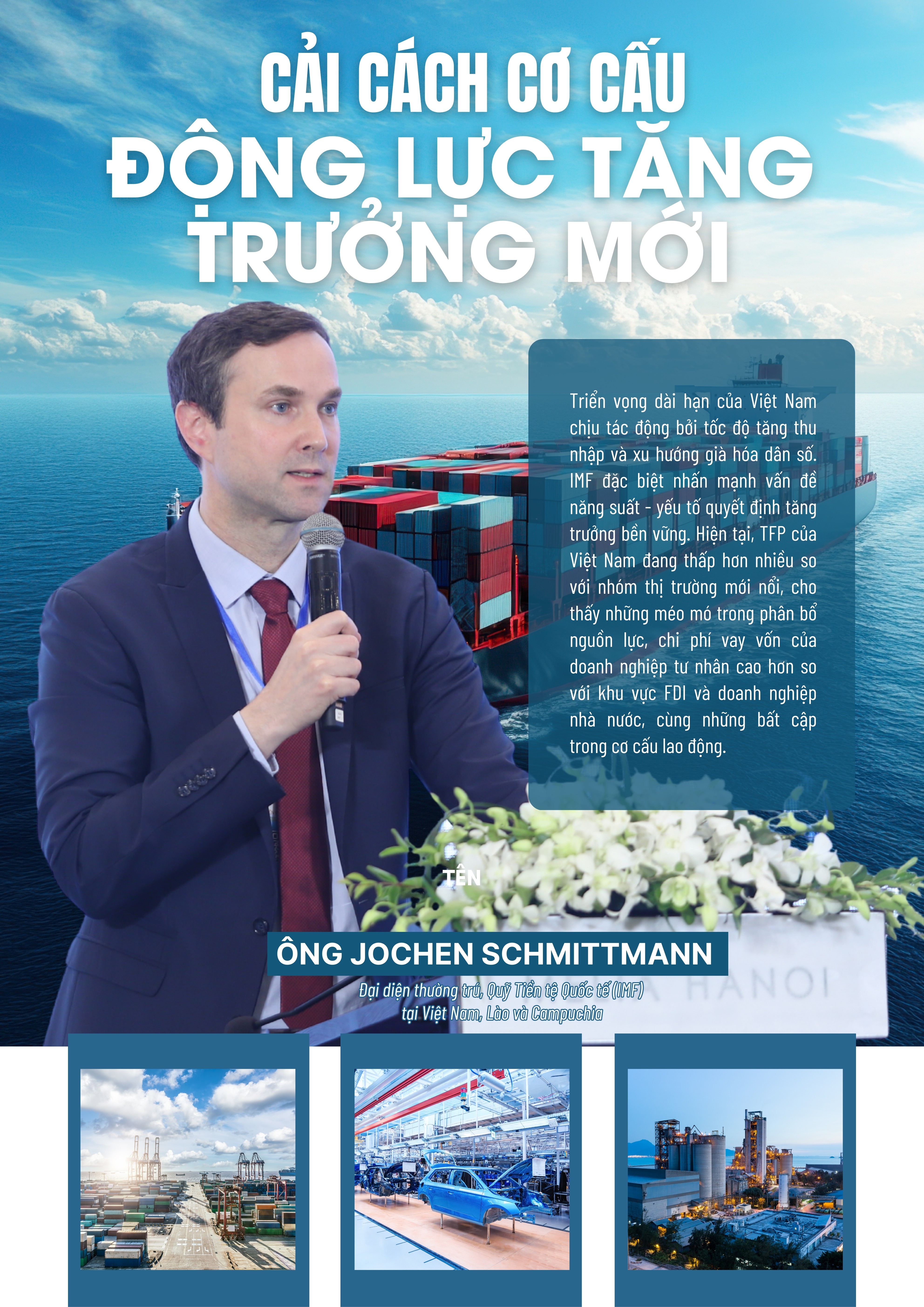 “Triển vọng dài hạn của Việt Nam chịu tác động bởi tốc độ tăng thu nhập và xu hướng già hóa dân số. IMF đặc biệt nhấn mạnh vấn đề năng suất - yếu tố quyết định tăng trưởng bền vững. Hiện tại, TFP của Việt Nam đang thấp hơn nhiều so với nhóm thị trường mới nổi, cho thấy những méo mó trong phân bổ nguồn lực, chi phí vay vốn của doanh nghiệp tư nhân cao hơn so với khu vực FDI và doanh nghiệp nhà nước, cùng những bất cập trong cơ cấu lao động”, ông Jochen Schmittmann nhận định.