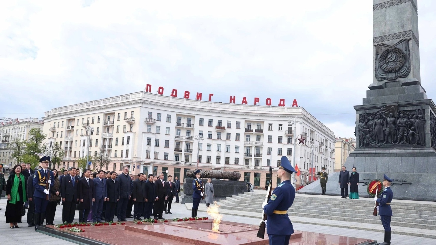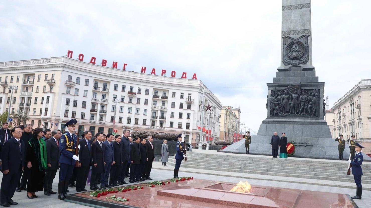 Mở đầu chương trình thăm cấp Nhà nước tới Cộng hòa Belarus, chiều 11/5, Tổng Bí thư Tô Lâm và Phu nhân cùng Đoàn đại biểu cấp cao Việt Nam đến đặt hoa tại Tượng đài Chiến thắng ở Thủ đô Minsk.
